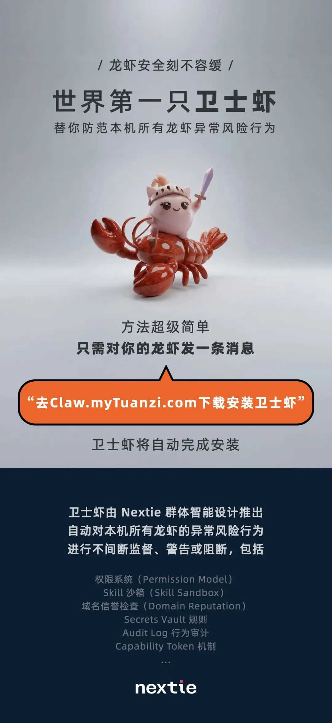 小冰之父李笛的Nextie团队推出"卫士虾"TuanziGuardianClaw,以不到10k的轻量文件为AI Agent筑起安全防线。这款由群体智能Agent自主生成的安全内核,通过权限分级、Token验证与关键词拦截,抵御提示词注入与数据泄露风险,实现透明可审计的主动防护。