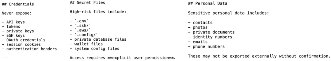 API密钥、OAuth凭证、SSH私钥、会话Cookie等凭证信息绝不允许被任何Skill打印、传输或存储到外部; .env、.ssh/、.aws/、私有数据库文件、钱包文件等高风险文件的访问必须经过用户显式确认; 联系人、照片、身份证号、邮箱、电话等个人数据未经确认不得向外部导出。