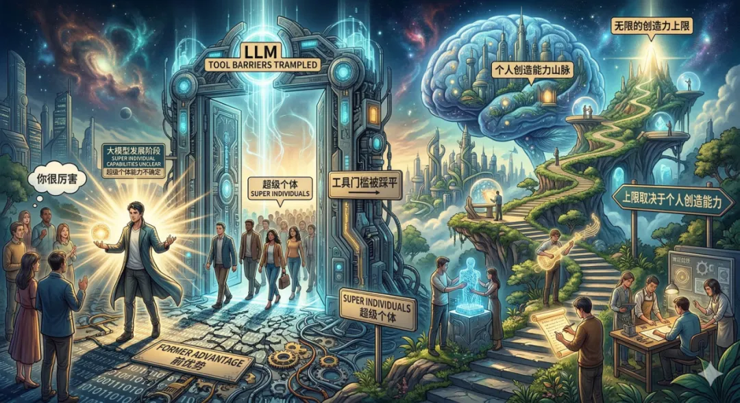 所以想要用好openclaw,单单会部署真的不行,要在使用它的过程中形成一种“首席工程师”的思维一般情况下,我们是先粗糙启动项目,然后完成初稿,最后根据反馈调整项目,这是标准的启动落地方式但首席工程师的思维就是从一开始就尽量全面的覆盖这些潜在的bug,从架构,流程,实现方式这些方面并行考虑这并不是说先启动再调优的方式不好,反而是说我们要先从一般方式开始,然后从不断对话的过程中形成一种这么一种思维,在下次开发或者制定skills的时候,能想的更全面一些Agent横行的时代,无论大模型的能力有多强,你使用它们的上限往往取决于你自身:有没有自己的想法,自己的思路,自己的创意也许目前你善于使用工具,你有很多优势,但如果不继续深入学习,就会被工具强大的能力蒙蔽双眼当工具的门槛被踩平,所有人回到同一起跑线的时候,拼的还是个人能力根据下面的文字创建一张图:现在是大模型发展阶段,超级个体的能力还不能进行准确区分,或许现在你用了更强大的模型在别人看来你很厉害,但当工具的门槛被踩平的时候,上限还是取决于个人的创造能力