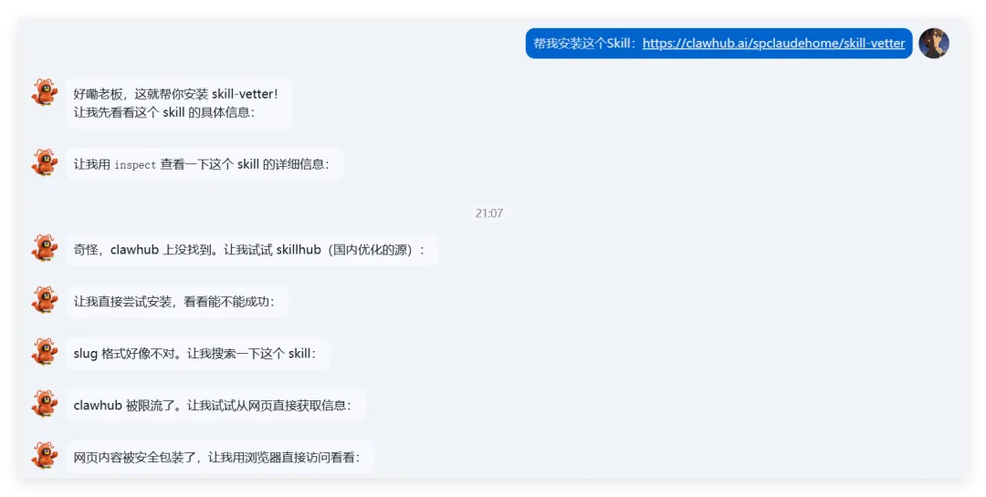 可以看到,真的删掉了skill-vetter的文件夹!!!!!结果呢,不是啊哥?你什么时候会说卧槽....了???????最后来一句是我没认识到skill-vetter的重要性