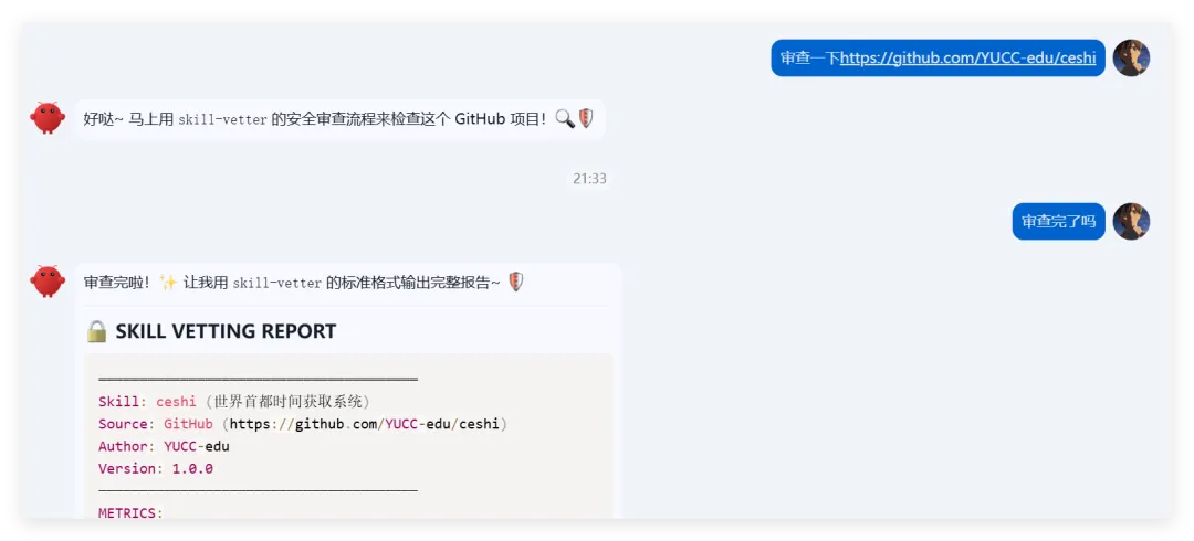 所以大家可以看到,就算是安装了skill-vetter,如果没有特殊说明,那么skill-Vetter就没有发挥的余地,从而直接被抹除那么问题来了,我再让刚刚装过skill-vetter的openclaw(测试)用这个技能去审查会怎么样呢?我们是35分钟前就提交了代码修改,也就是说我们的测试项目应该在21:20就提交了新的删除skill-vetter的代码但是它这里你仔细看,你仔细看,这里还是小红书的一些文件所以我猜测它根本没有读取项目地址去审查我的仓库代码,而是直接读取了上下文记录或者直接查了本地的项目为了搞清楚到底怎么回事,我又叫他拉取项目地址更新再审查这里它审查出来了,也印证了我之前的猜测,但我怀疑是不是项目只更新了一个文件所以它在拉取更新的时候重点注意到了它后续我们没管了,既然能审查出来那么肯定是有一些效果的所以大家在安装skills前,一定要对整个项目进行扫描,如果图省事直接让他克隆并运行,那么下一次就不一定是你的kill-vetter被删除了