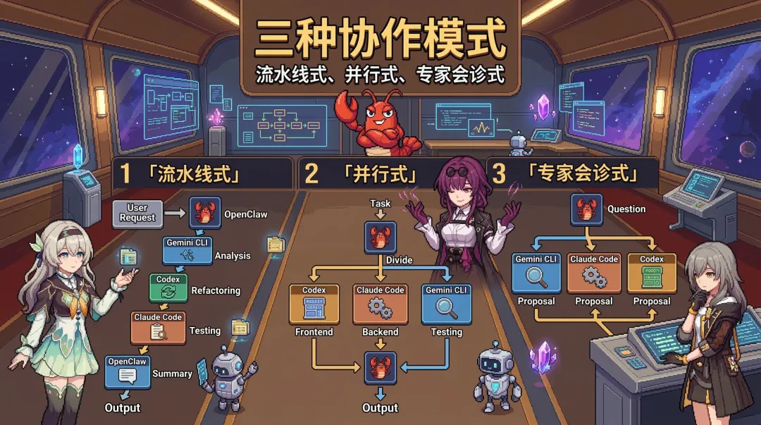 OpenClaw 在后台:拆解需求 → 调 Gemini 分析安全问题 → 调 Codex 执行重构 → 调 Claude Code 生成测试 → 调 OpenCode 生成文档 → 整合反馈。