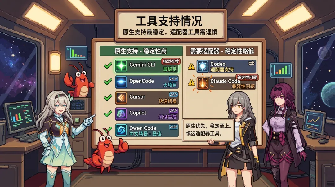 根据 acpx 官方文档,不同编程助手的支持情况差异很大。重点关注三个核心工具:Gemini CLI、Codex、Claude Code。