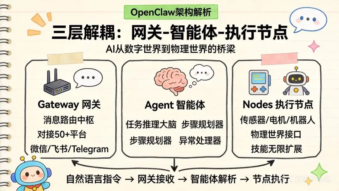 OpenClaw采用"网关-智能体-执行节点"三层解耦架构,天生适配复杂的硬件控制场景。