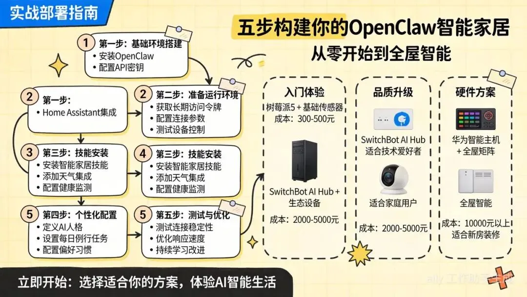 核心设备:SwitchBot AI Hub + 米家/华为生态设备 成本:2000-5000元 适合人群:家庭用户、追求体验 优点:即插即用、稳定性好、生态完善 缺点:成本较高、存在品牌依赖