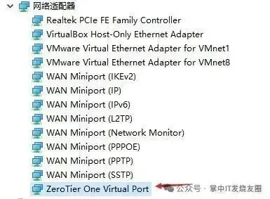 连接成功后,两台异地的电脑就在同一个局域网了,和局域网两台电脑并没有区别。另外我们会在网络适配器中,看到多了一张“ZeroTier”命名的虚拟网卡。