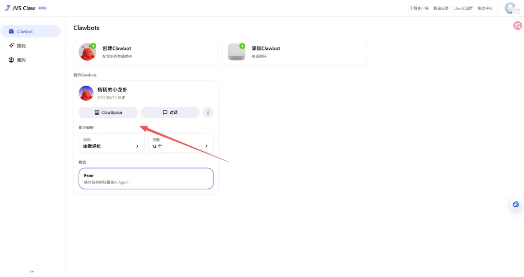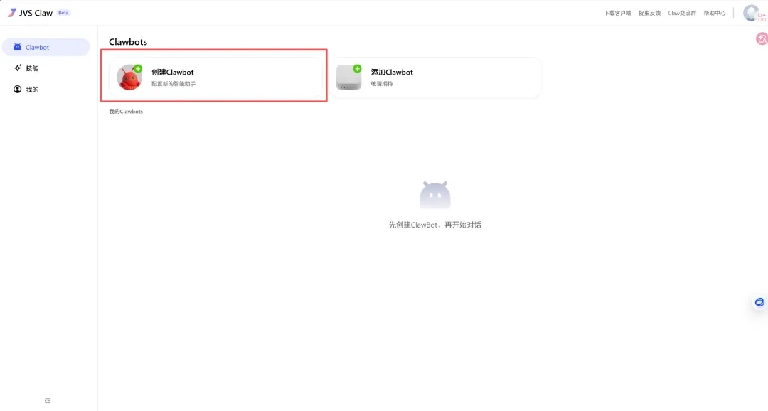 这里先点击“创建ClawBot”。