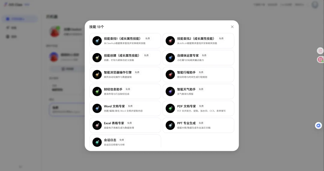 能自己根据需求安装技能,能创建技能,还有办公的技能及搜索引擎和自媒体运营的技能。