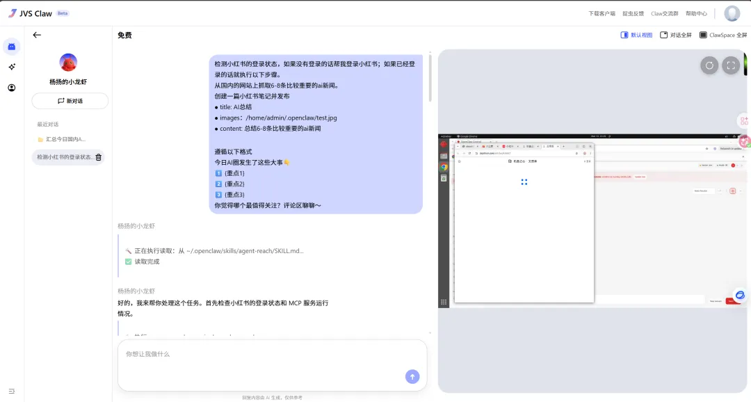 而右半部分的ClawSpace就是小龙虾在网页执行的情况。