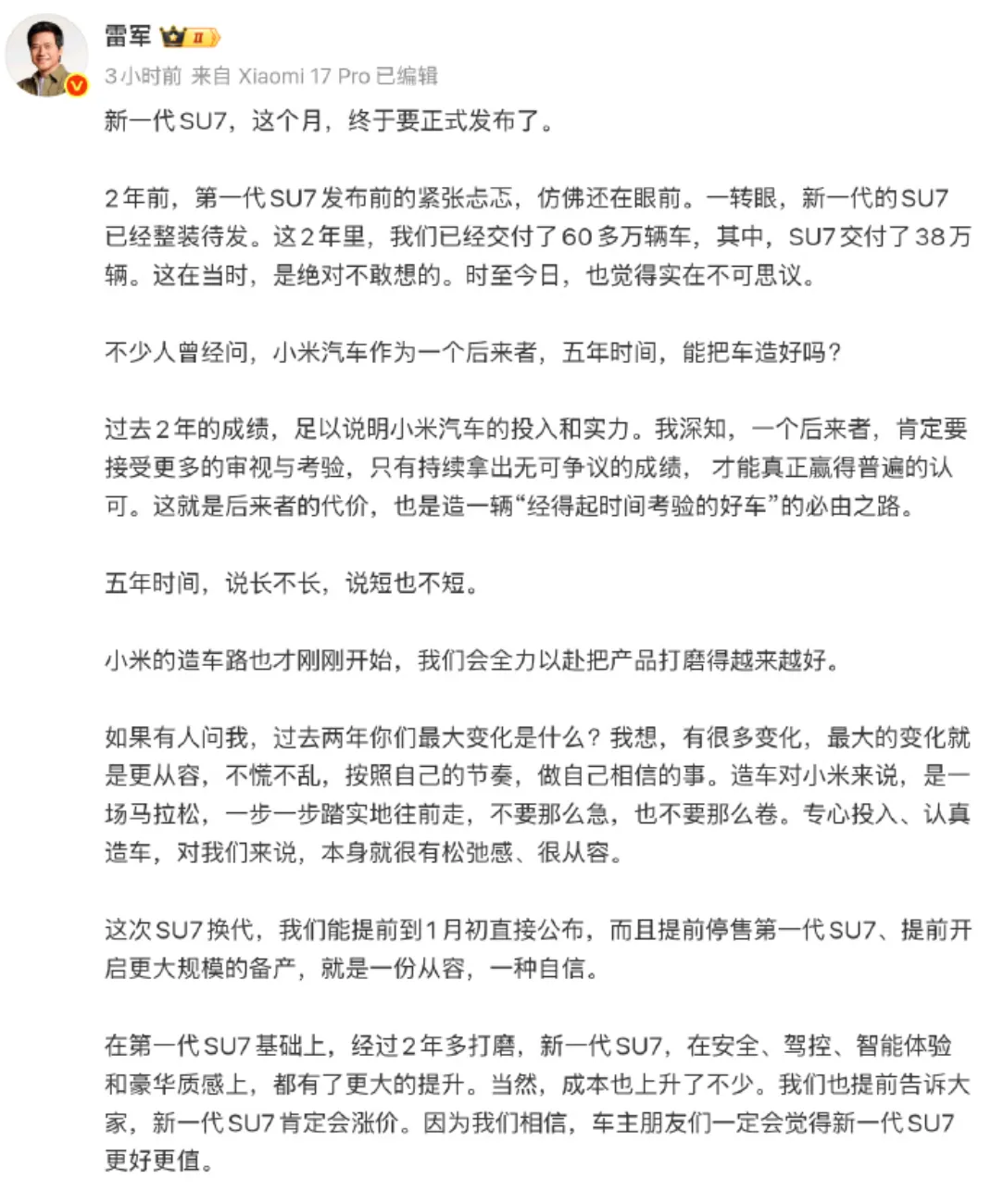 2.小米新一代SU7确定本月发布