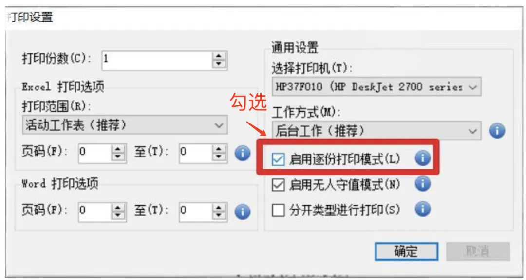 打印设置:勾选启用逐份打印模式,这点需要特别注意的。