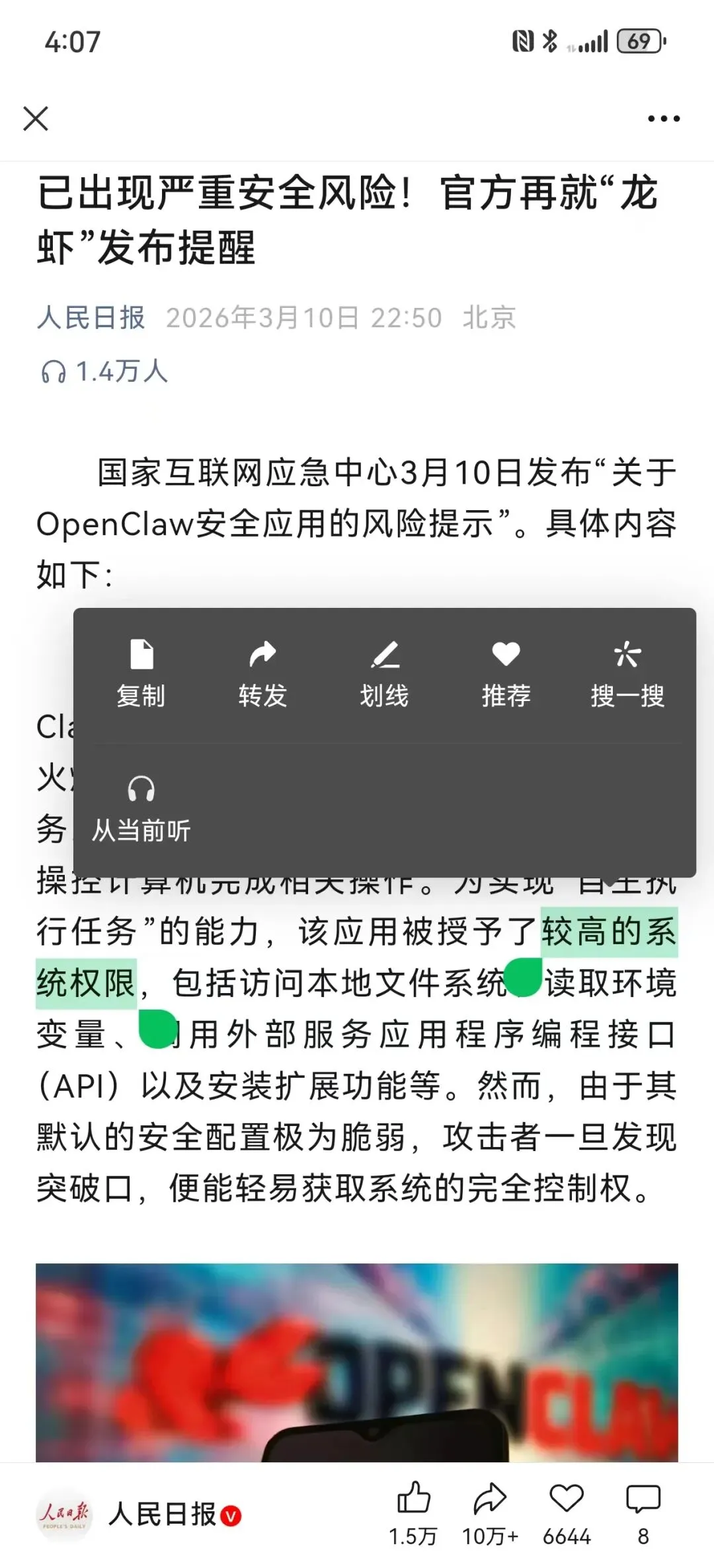 外国版的权限很高,能够不经过你同意就做事,这也带来了很多安全隐患。因此,人民日报多次发文,提示有风险,注意安全。里面我选中的地方,就是重点强调权限。