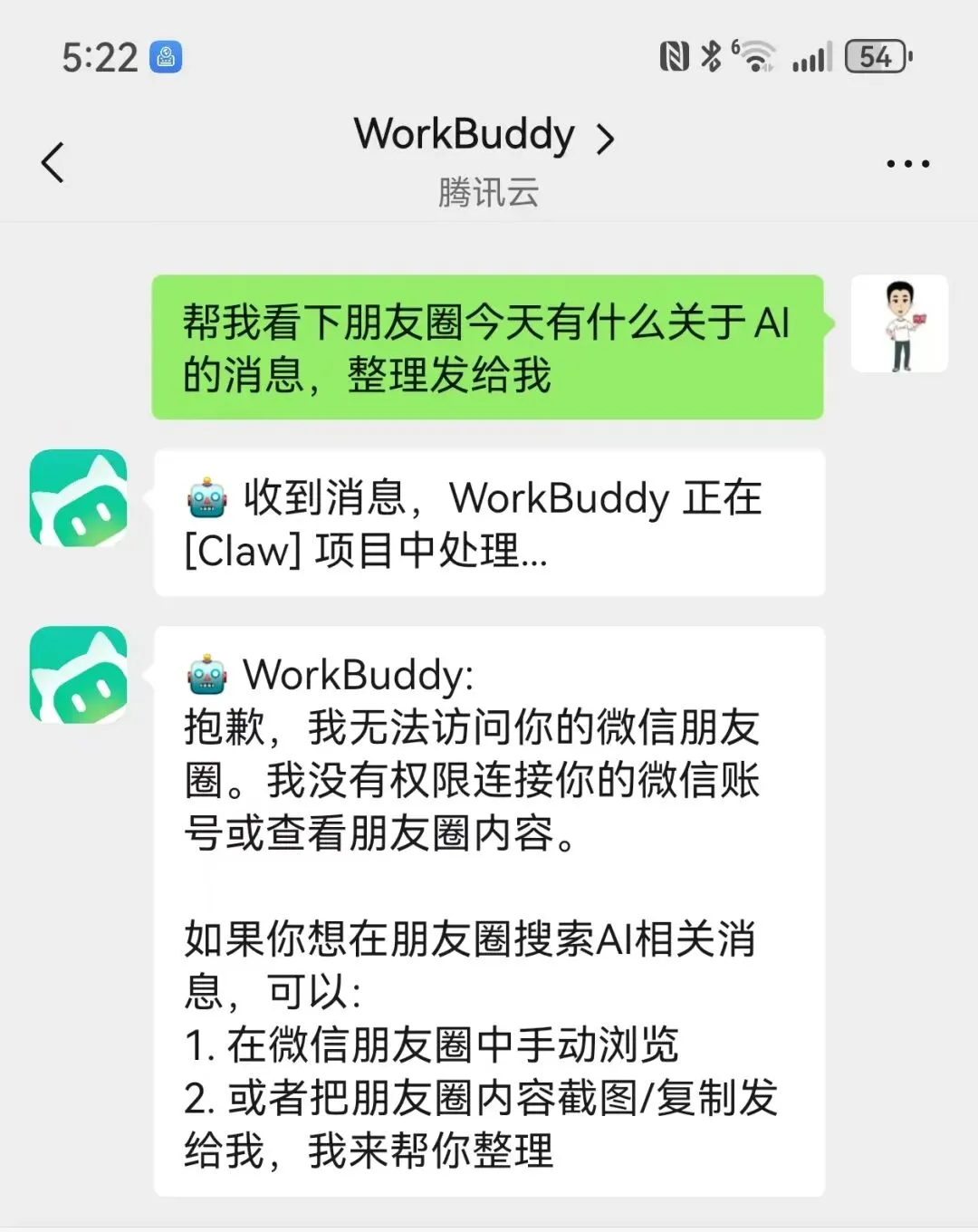 为了安全,目前大多数人安装的都是中国版小龙虾,这种目前几乎没风险,同时权限也低得可怜。比如微信的任何东西都无法调用,连查看朋友圈都没权限。