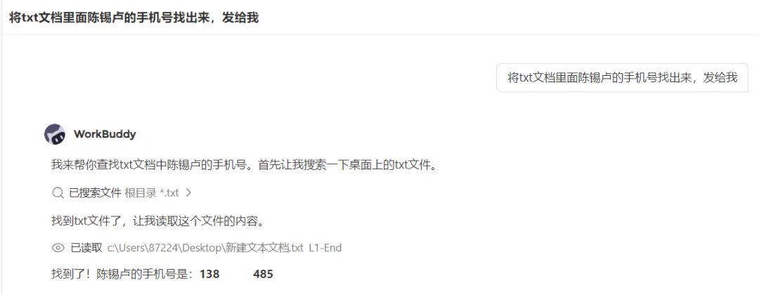 比如,我在桌面的txt里面放了很多内容,让她查找陈锡卢的手机号。