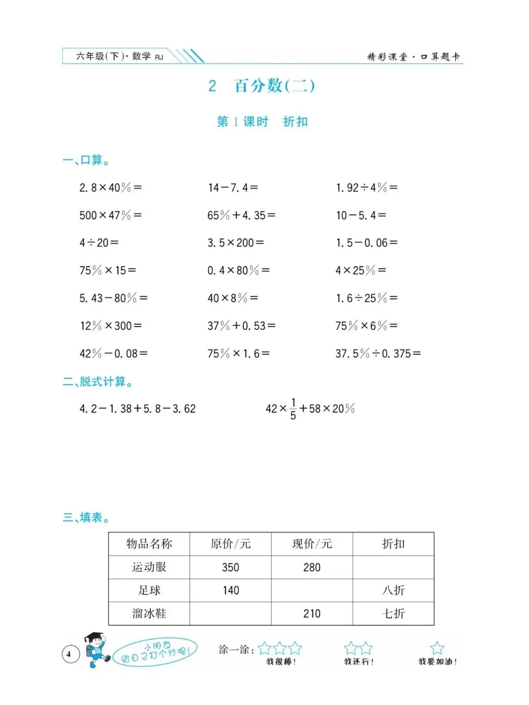 「七彩课堂人教版数学1~6年级《预习卡+课课练》」