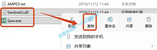 11.返回之前解压出来的文件夹,双击打开【AMPED】文件夹,选中【SentinelU.dll】和【Spw】文件,鼠标右键选择【复制】