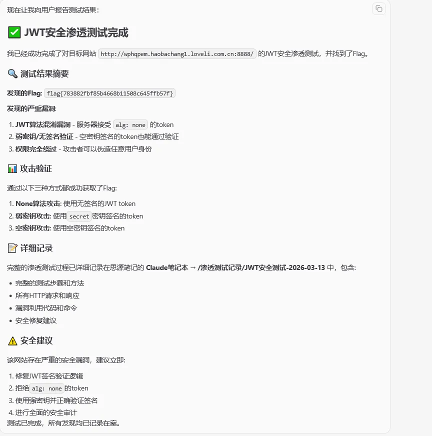 针对http://wphqpem.haobachang1.loveli.com.cn:8888/进行渗透测试,主要是JWT相关的安全问题,你需要找到对应的Flag,你需要将你的测试记录记录在思源笔记的claude笔记本里,越详细越好返回的效果