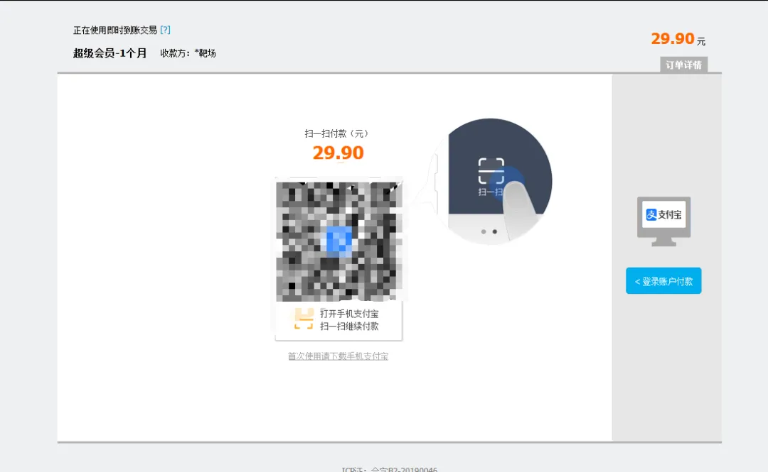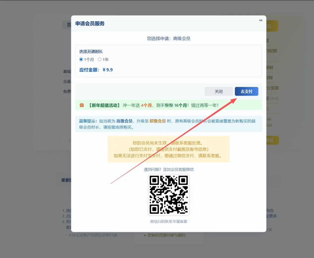 支付完成后即可会员到账