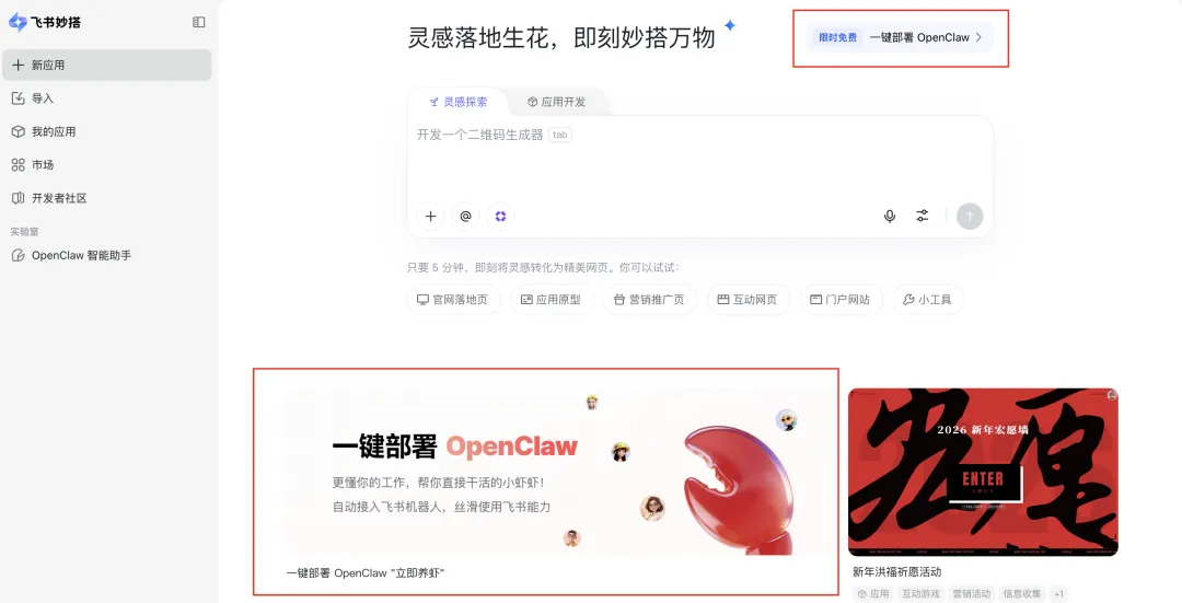 进入妙搭首页,右上角有个「一键部署 OpenClaw」 链接按钮,以及下方醒目的「一键部署」图片 banner,都是入口。