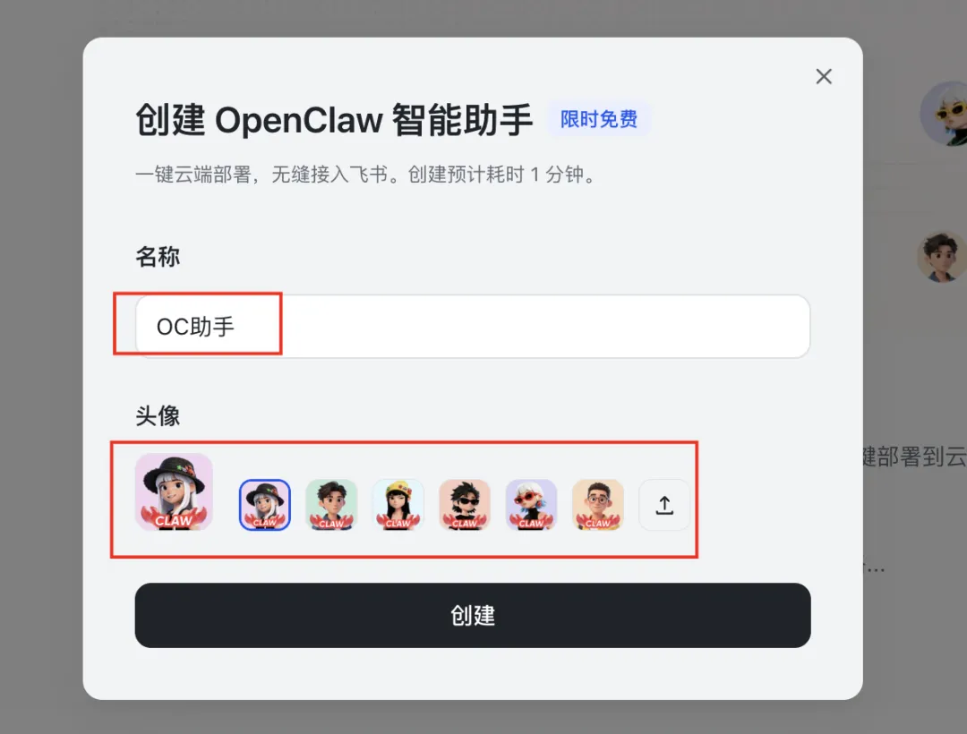 在对话框里输入名称,选择或上传头像,随后点击「创建」按钮。