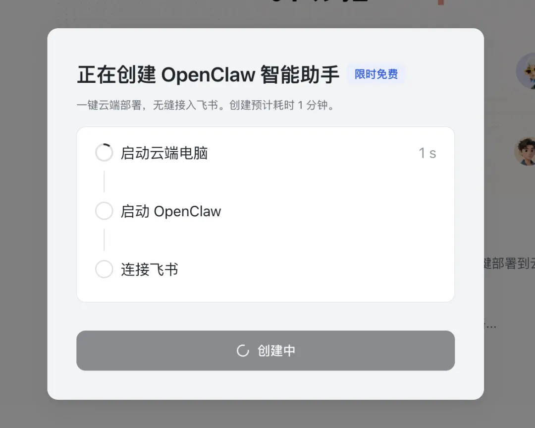 正式执行创建,三个步骤「启动云端电脑」、「启动 OpenClaw」、「连接飞书」依次执行。