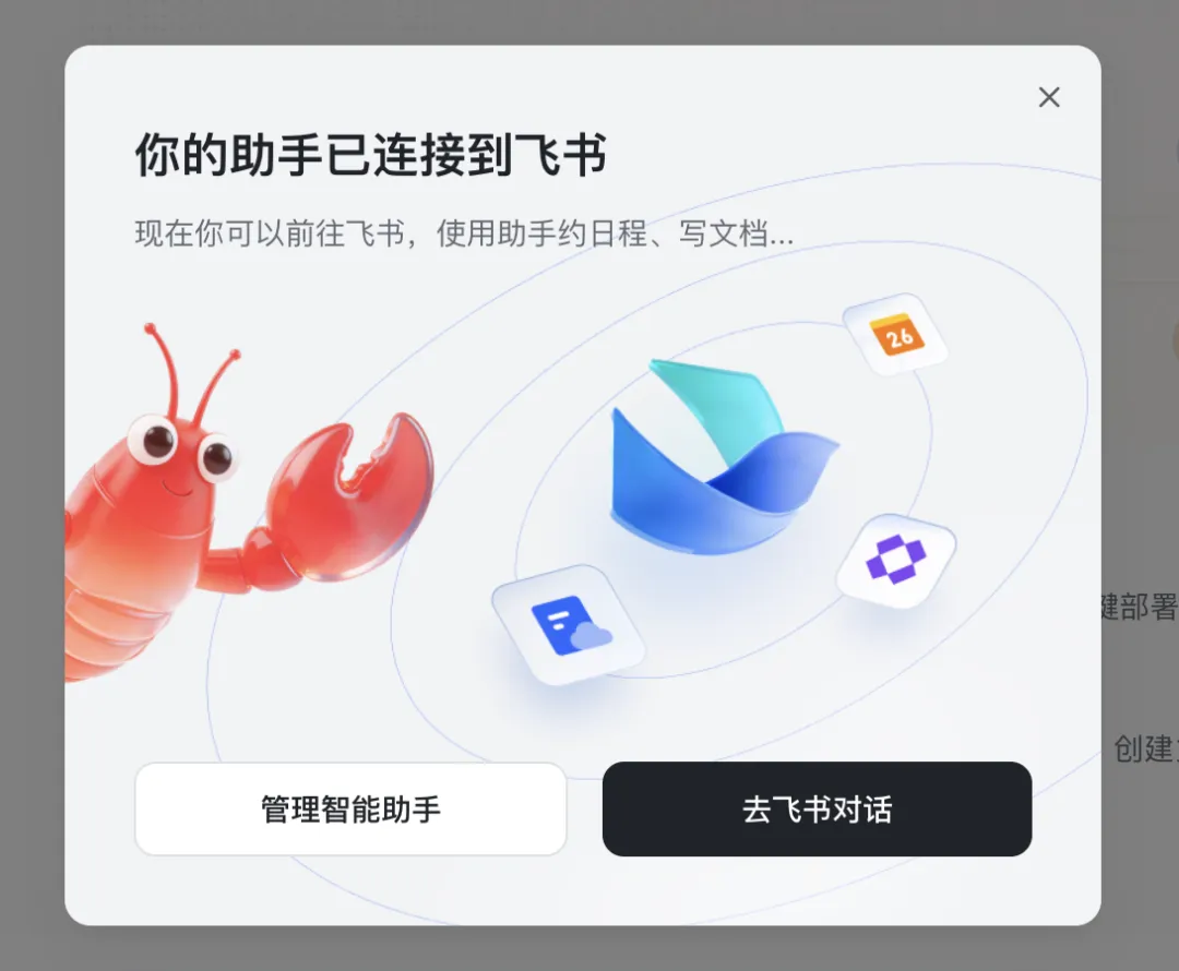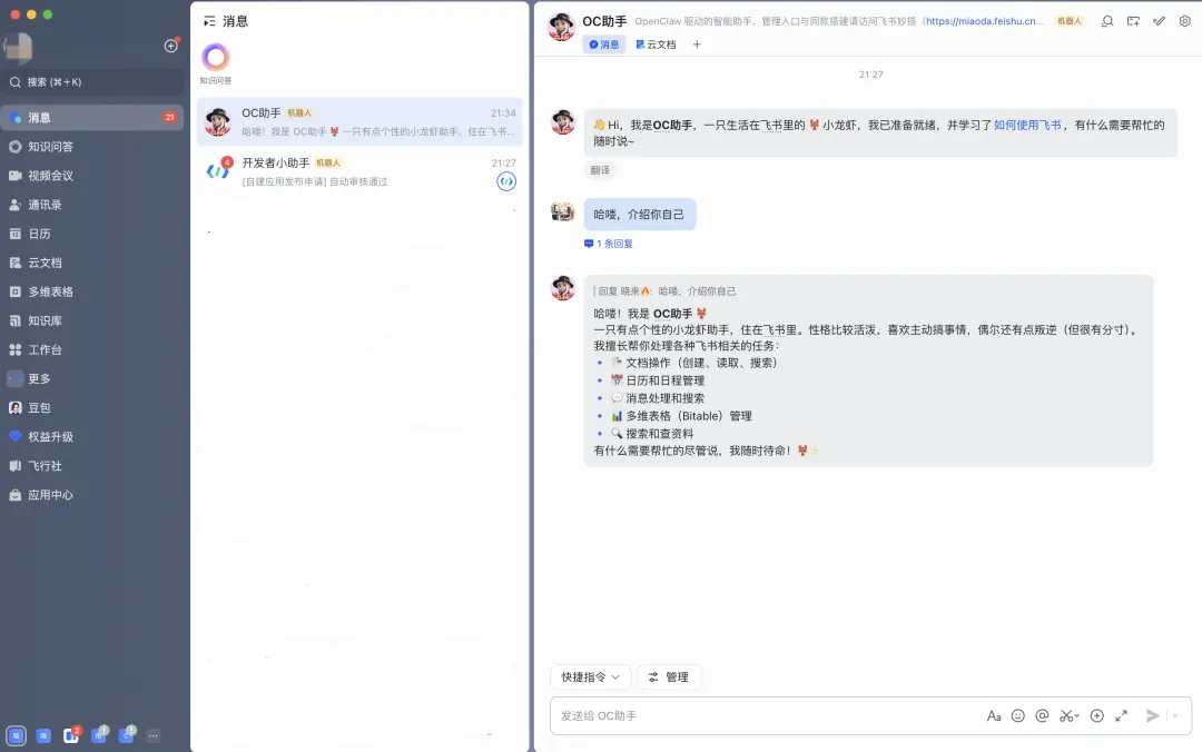 点击「去飞书对话」按钮,则直接跳到飞书客户端的消息对话窗口,省去一切手动配置飞书权限和回调等操作的繁琐步骤。