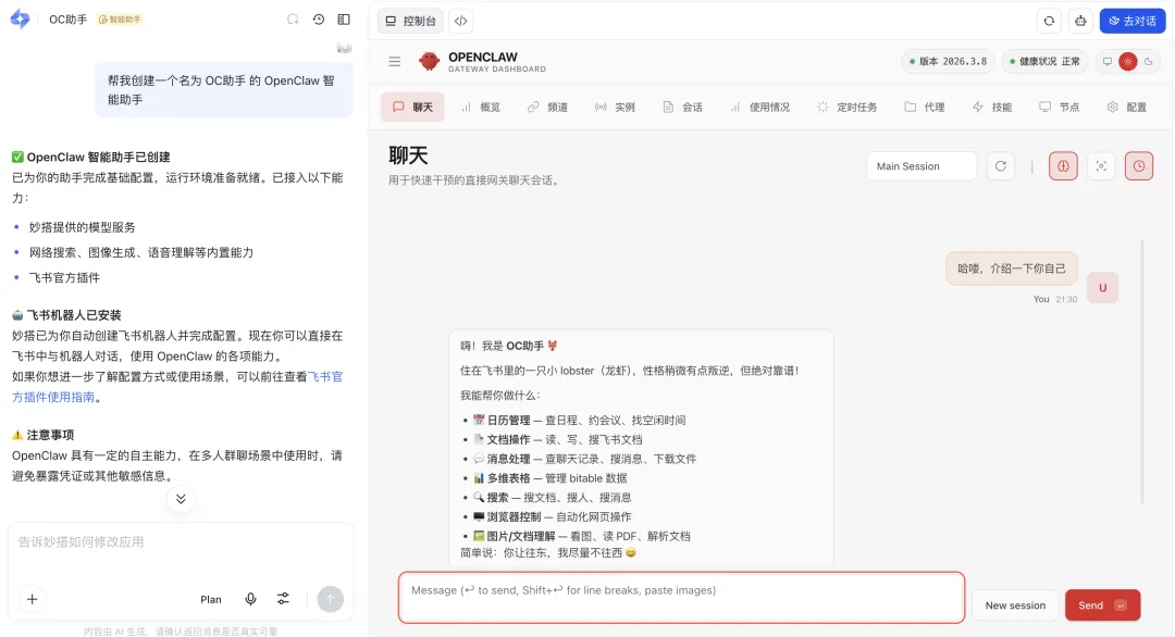 然后,你就可以在飞书中与 OpenClaw 进行各种对话交互了。