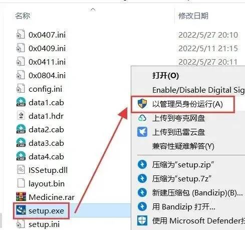 4.选中【setup】程序,右键选择【以管理员身份运行】。