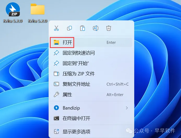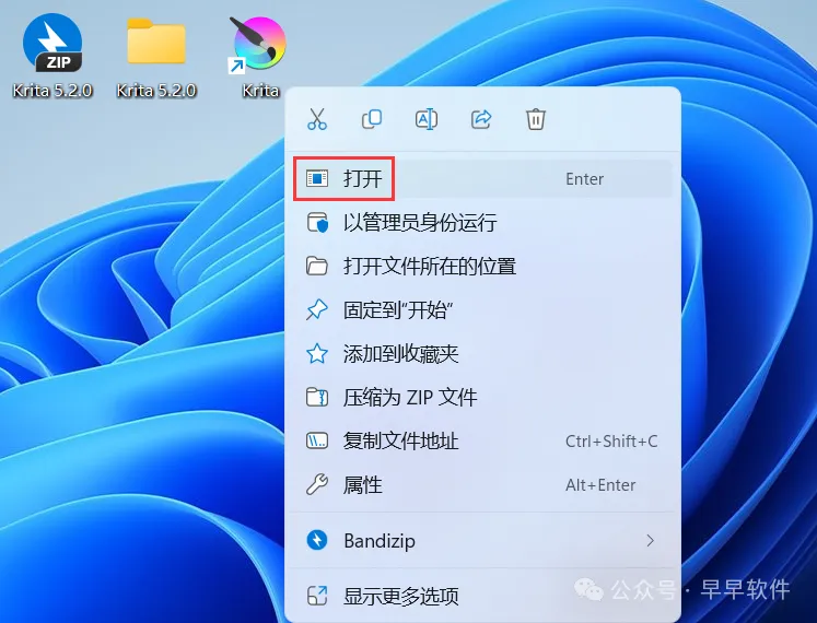 15、回到桌面,右键桌面上的【Krita软件图标】,点击【打开】
