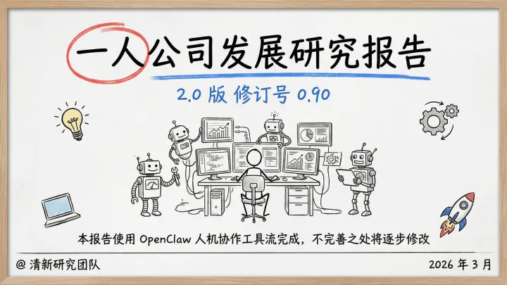 在上述OpenClaw人机协作工作流实践基础上,正式推出《一人公司发展研究报告2.0》。百页报告仅耗时2天完成,报告基于既有一人公司研究成果,系统分析其发展逻辑、核心能力与技术支撑,为关注AI与新型组织形态的读者提供参考。