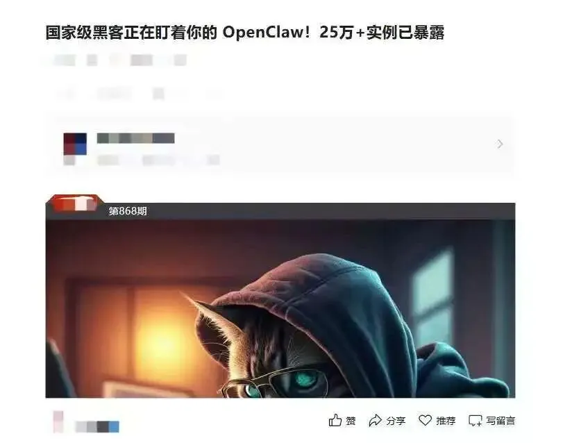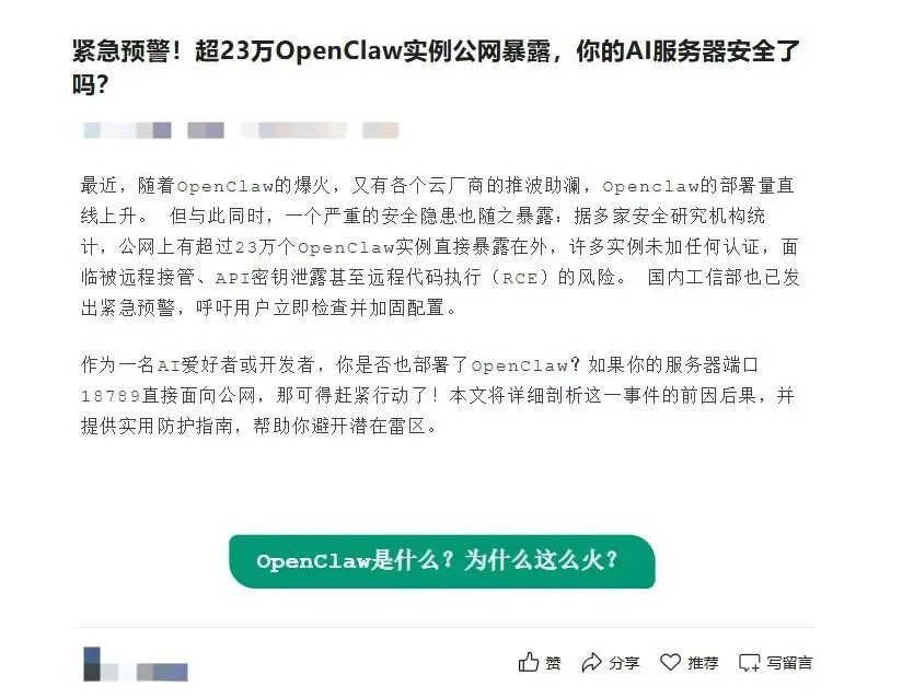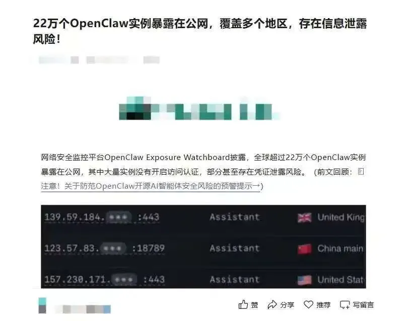 与此同时,一些安全报告和社交媒体讨论中不断出现诸如“公网暴露超过20万实例”、“AI代理可能被攻击者利用”、“大量实例处于无防护状态”等话语。