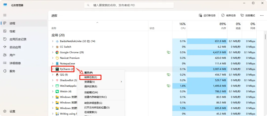 彻底关闭CMD、PowerShell、PyCharm、VS Code、Jupyter等所有调用Python的程序与工具;按下Ctrl+Shift+Esc快捷键打开任务管理器,在进程列表中找到并结束Python、py、pip相关的所有进程,杜绝卸载时文件占用、无法删除的报错问题。