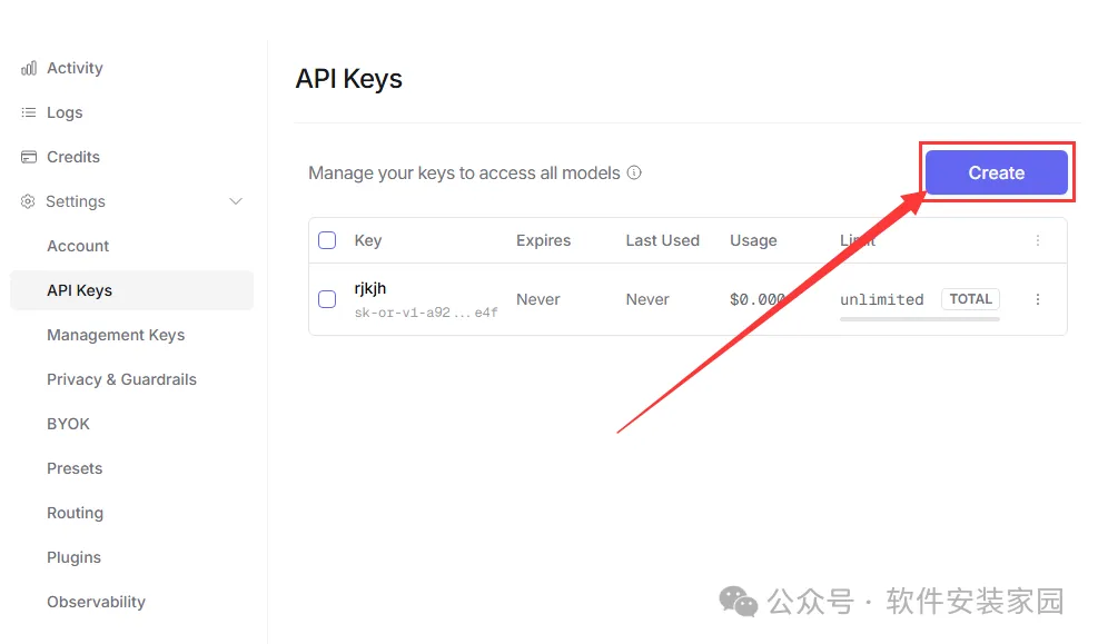 打开openrouter,去注册账号,获取一个密钥,页面会自动打开 openrouter 页面(网站是国外的访问较慢),注册并登录账号。然后点击【Create】创建一个 apikey。