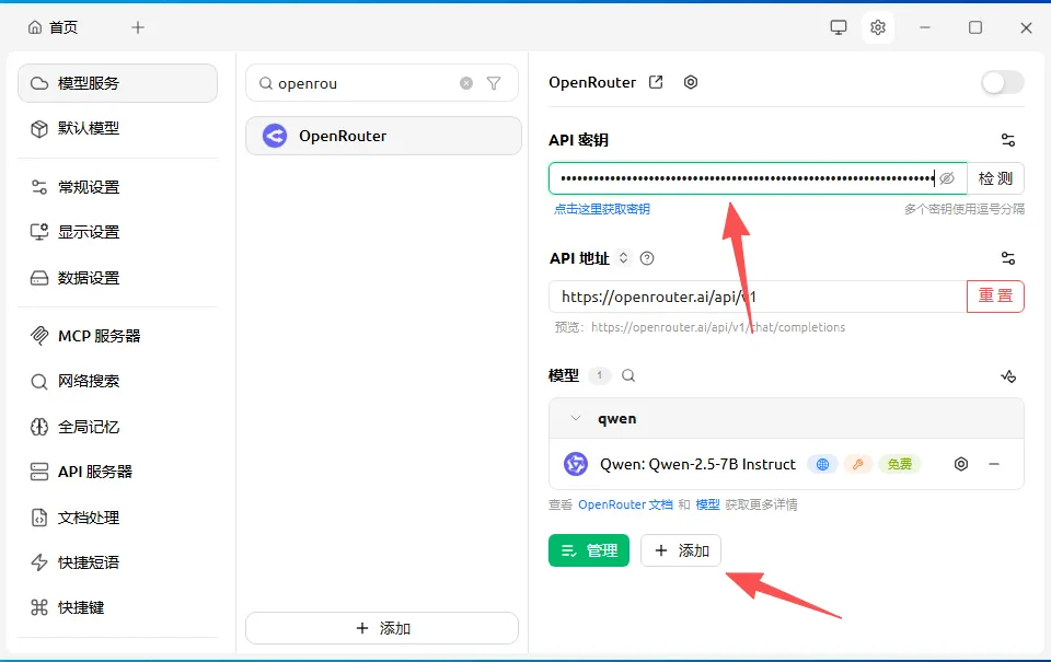 3.4、在【cherry studio】,输入创建的【apikey】然后点击添加。