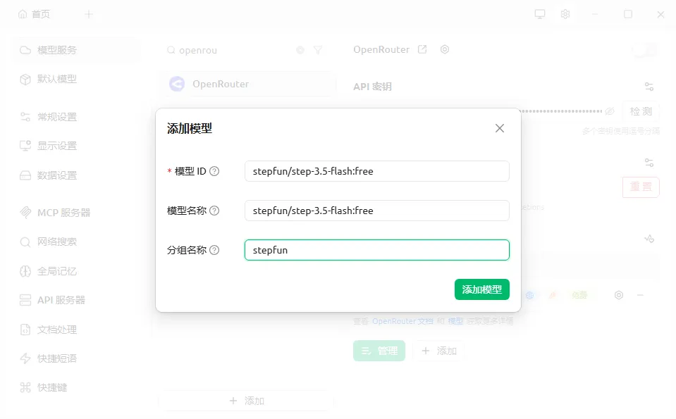 3.5、这里将这个免费模型名称粘贴进去:stepfun/step-3.5-flash:free