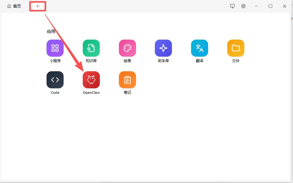 4.1、在首页的【+】号,选择openclaw。