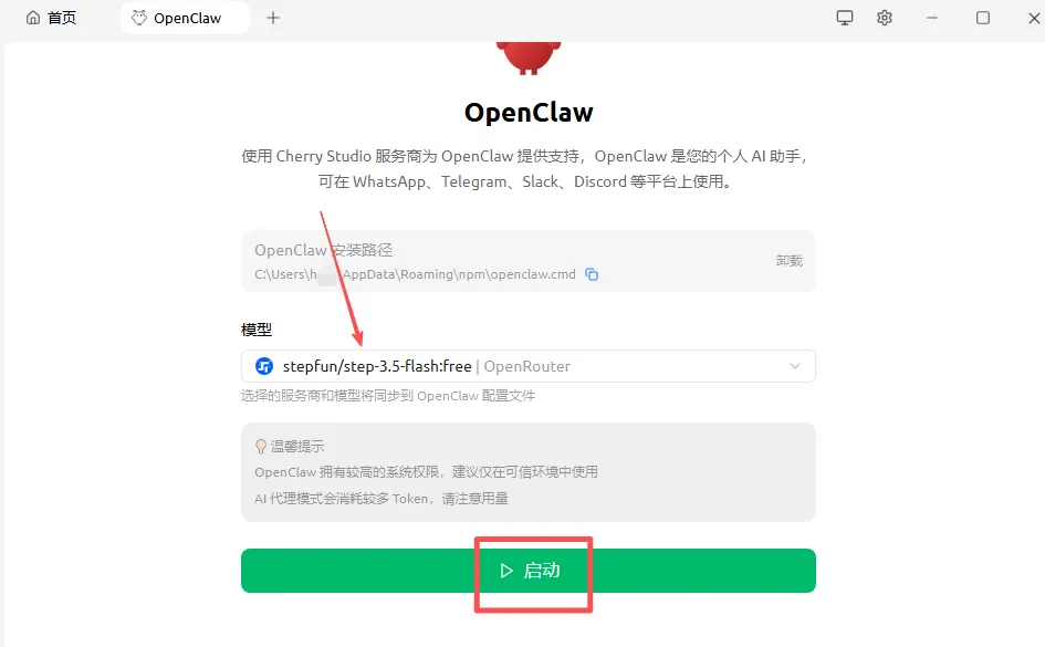 4.4、完成后,选择我们的【stepFu/step-3.6-flash:free】模型,然后【启动】。