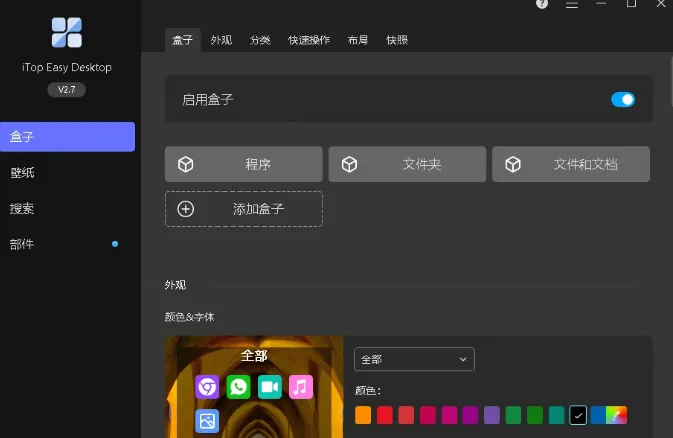 iTop Easy Desktop 最直观的功能在于其强大的桌面整理能力。它引入了“盒子(Box)”的概念,允许你在桌面上创建多个透明的分区。你可以将相关的文件、快捷方式或文件夹拖入对应的盒子中,实现视觉上的井井有条。 更智能的是,它支持自动分类规则。你可以在设置中配置文件类型与盒子的对应关系,软件便会自动将新增的文档、图片或安装包归类到指定区域,无需你手动拖拽。此外,软件还支持多桌面页面,让你可以将工作、娱乐、学习等不同类型的文件分屏存放,通过简单的切换即可扩展桌面空间,彻底告别拥挤。