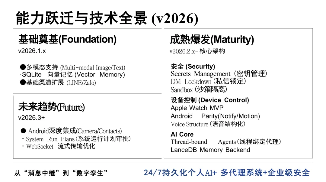 作为开源 AI 代理生态,其数据截止 2026 年 3 月 3 日拥有 253k + 星标、880 位贡献者,定位为本地优先、单用户、自托管,核心理念是隐私至上、安全沙箱、用户完全掌控,已实现 10 + 平台集成;演进从 2025 年 11 月的个人周末实验项目,逐步完成代码重构、品牌确立,2026 年 2 月后进入功能井喷的爆发期。