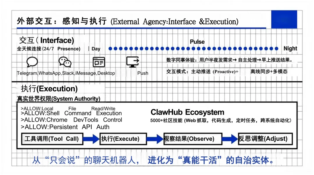 OpenClaw 实现了从 “消息中继” 到 “数字孪生” 的跨越,具备范式重塑、自我信息、自我进化、主动执行、持久化、统一控制六大核心特点,是拥有 24/7 持久化个人 AI + 多代理系统 + 企业级安全的自治实体。