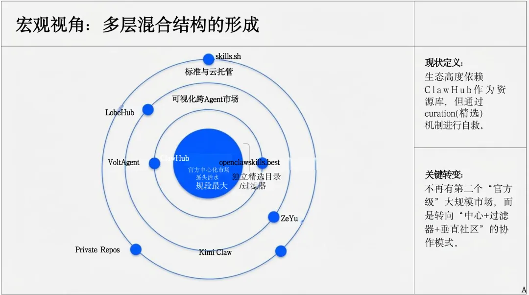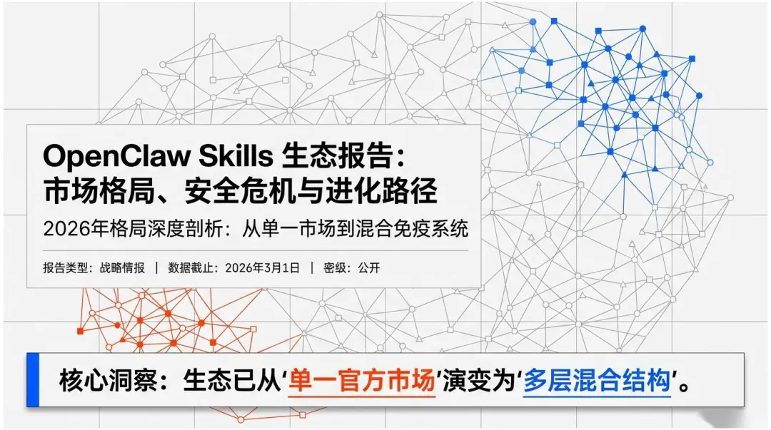 其技能生态已形成 “中心 + 过滤器 + 垂直社区” 的多层混合结构,核心以 ClawHub 为创新源头,openclawskills.best 为安全过滤器,VoltAgent、LobeHub 为精选垂类平台;但生态存在严重安全风险,早期恶意技能、ClawHavoc 攻击频发,本体论风险远超传统 npm 包,且存在极客门槛高的问题。