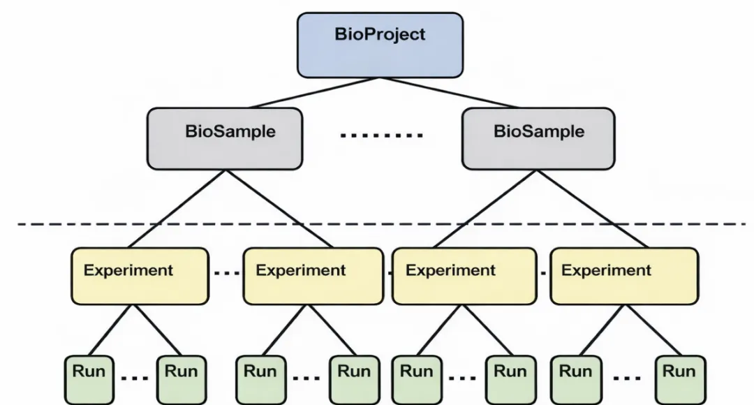 最上层通常是 BioProject,可以理解为一个完整研究项目的总入口,用来概括某项研究的整体设计与背景;一个 BioProject 往往会关联多个样本和多组测序数据。