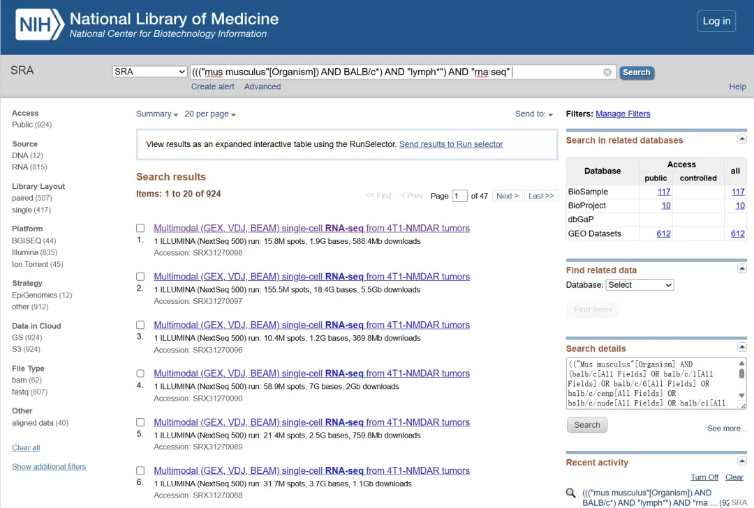 具体来说,可以先在 NCBI 的 SRA 检索页面中,根据研究对象和测序类型设置关键词进行搜索。比如,如果我们想查找 BALB/c 小鼠淋巴结组织的 RNA-Seq 数据,就可以在检索框中输入相应的组合条件,将物种、品系、组织类型和测序策略一并限定,例如((("mus musculus"[Organism]) AND BALB/c*) AND "lymph*") AND "rna seq"[Strategy].。