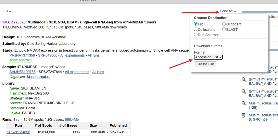 接下来,选中具体的条目,在页面上方选择 Send to,输出方式选择 File,文件类型选择 Accession List,即可将这些记录对应的 accession 列表保存下来。