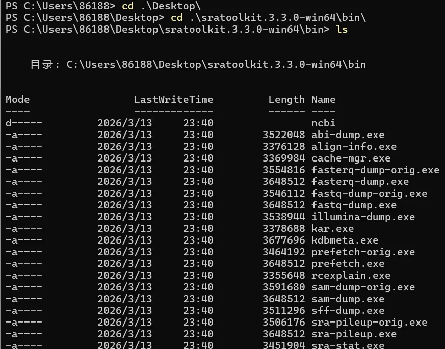 接着打开命令行窗口,进入解压后的文件夹,再切换到其中的 bin 目录,后续的大多数命令也都是在这个目录下执行,但要注意后面下载的测序数据最好不要放在这个目录。
