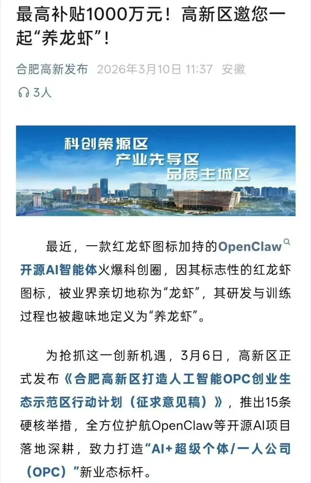 安徽合肥高新区 发布《人工智能 OPC 创业生态示范区行动计划》,提出 15 条扶持政策,最高可获得 1000 万元 资金支持。