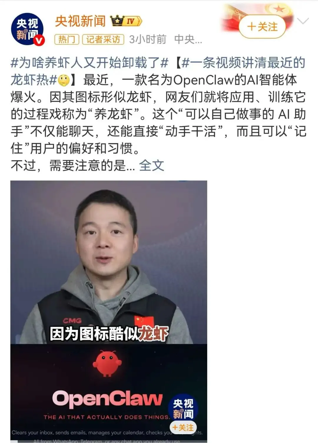 最近几天,互联一款开源 AI 智能体工具 OpenClaw被网友称为"龙虾” 迅速火遍科技圈。