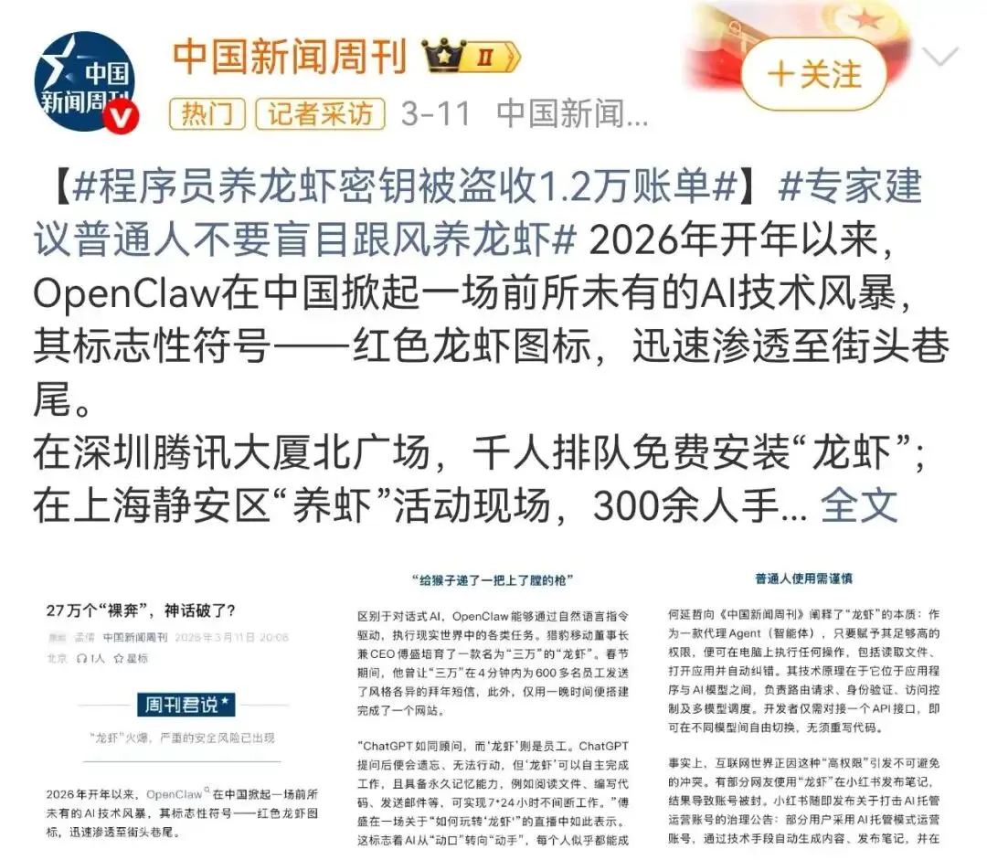 不过,当越来越多人开始尝试“养龙虾”,一些问题也逐渐暴露。