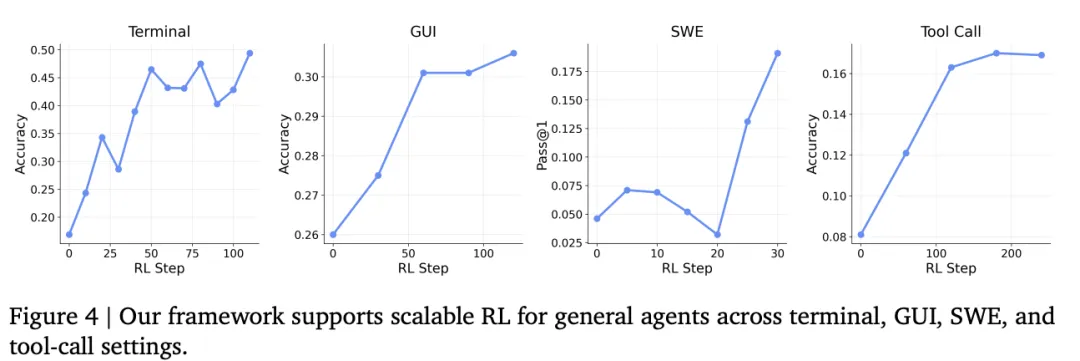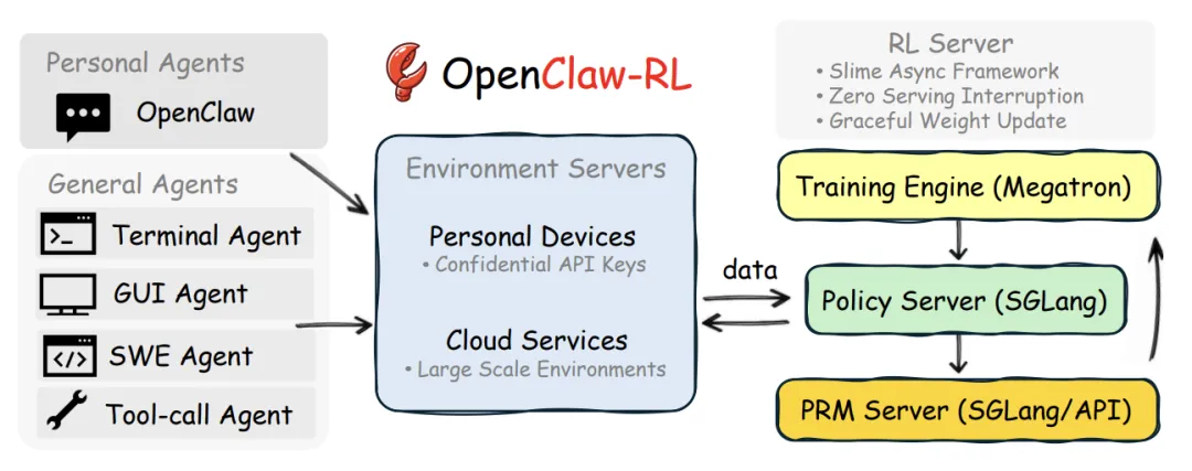 策略推理:高效响应用户请求。 环境模拟:支持 128 个以上的并行环境(针对终端代理),实时收集交互流。 PRM 判别:利用多数投票制对交互结果进行多维度评估。 策略训练:在后台异步更新权重。