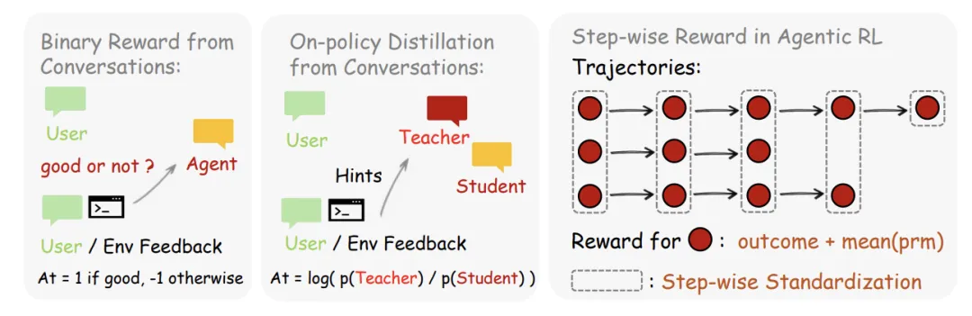 评价性信号:通过"下一状态"隐性地为前一个动作打分。用户的重复提问暗示不满,测试通过代表成功,错误日志标示失败。这些信号被提取为标量奖励。 指示性信号:包含更高级的纠正方向。例如用户说"你应该先检查文件再编辑",这不仅是差评,更指出了 Token 级的改进逻辑。